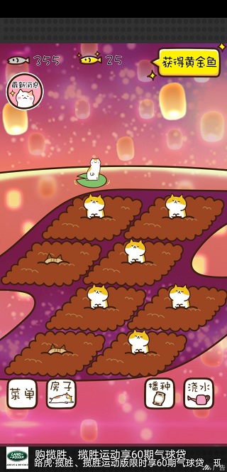 A:从商店里买猫咪种子,然后到地里种下,浇水,会提示过几分钟猫咪就会长出来了,长出头后再过几分钟就可以收获了,收获猫后会自动获得小鱼干,也可能有金小鱼干,可以在商店买种子,道具和房间背景。