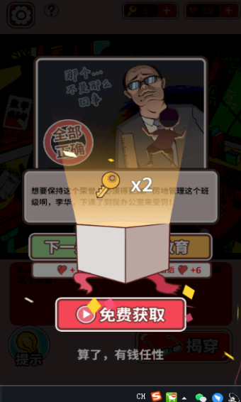 班主任模拟器趣味十足搞笑的一款点击类手机游戏。这次给大家带来的是班主任模拟器破解版,改版本中关卡已经全部解锁,钥匙和体力可以无限领取,祛除了广告带给你的困扰。相信大家在校园时代一定特别讨厌班主任吧,反正我很讨厌,可能只有好学生会喜欢老师。这款游戏里面你将扮演一个高中班主任,在教室中抓住那些上课不认真,爱捣蛋的学生。也不是那么好抓的,一般学生们都会说谎,所以这个时候就需要你的火眼金睛去找出学生们露出的狐狸尾巴,帮助犯错的学生们改正错误,带领他们走上人生的正确轨道。班主任模拟器可以当你当一回老师,你也是从学生时代过来的,找些蛛丝马迹还不是轻而易举吗?游戏中有非常多的关卡,多达130多种,就等你来挑战了!