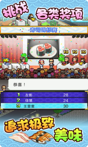 海鲜寿司物语中文破解版是一款非常有意思的,以经营回转寿司店为主题的模拟经营类游戏。该游戏采用了开罗游戏一贯的像素画风,配合轻快的背景音乐,给玩家带来休闲愉悦的游戏体验。在游戏中,玩家将会拥有一家老旧空荡的回转寿司店,你需要一步步的经营,将自己的寿司店变为全球最棒!在这经营期间,你需要想尽办法提高寿司的质量,增添升级店内的设施,来提高顾客的满意度;你需要布置好寿司店的格局,装饰寿司店的店面,提高知名度与魅力值,来吸引更多的客人;当然,仅仅这些作为是不够的,你还需要将获取的利润投入到扩张店面的大缺口,要实现成为顶级的寿司店,各个方面的投入是必不可少的。除此之外,在这里还有各种各样的原创寿司等着你的摸索,各种大赛等着你的参加。赶快下载游戏,来成为业内第一吧!