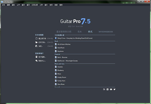 Guitar Pro是一款每一位音乐人必备的吉他和弦、六线谱、BASS四线谱绘制、打印、查看、试听软件,同时也是一款出色的MIDI音序器,MIDI制作辅助工具,能满足你MIDI的所有需求。GP强大的地方就在于它可以直接用鼠标和键盘按标准的六线谱、四线谱进行实时乐谱编辑、查看、打印和试听,在做弹拨乐器的滑音、倚音、推弦、揉弦、泛音、摇把、闷音、琶音、分解和弦、BASS打弦等方面有绝对的优势。今天小编带来的是Guitar Pro v7.5.4中文破解版,该软件提供许多阅读功能:3种类型的符号(标准/制表符/斜线),缩放和虚拟指板/键盘可直观显示手指在其上的确切位置。为一种或多种乐器创建自己的专业乐谱,并使用数字键盘,鼠标甚至MIDI乐器快速编辑每一个音符。声音引擎使用录音室中录制的200个音库和80个效果/安培模型提供了1000多种声音(预设)。在我们的内置声音中选择您的声音或创建自己的预设。享受一系列优化练习的工具:速度,弯管,节拍器,和弦和音阶库,吉他和钢琴指板。您还可以编辑或购买完整分数文件,然后可以独奏或静音单个声部。当在线查找标签时,该软件文件格式是最普通的。在线下载歌曲或访问我们团队在mySongBook上制作的2000个高质量的完整乐器选项卡。打印标签,在智能手机或平板电脑的Guitar Pro应用上阅读,或以PDF,音频,图像,MusicXML,MIDI等各种格式导出。