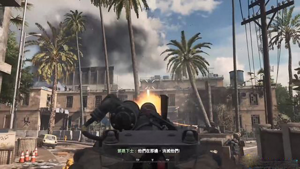 来到开阔地带就发现不对,从右至左扫射楼顶和窗户处出现的敌人。