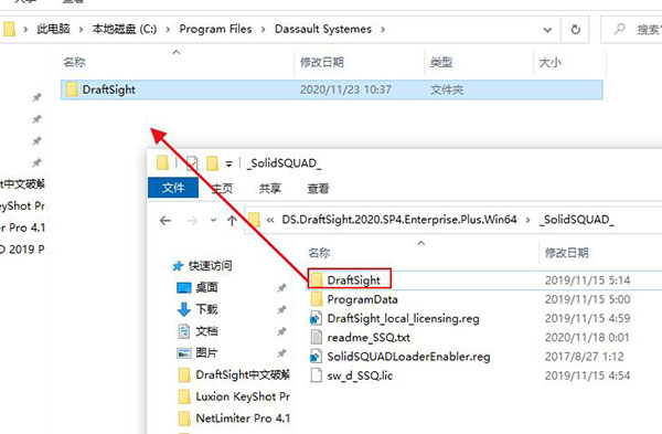 8、回到数据包中打开_SolidSQUAD_文件夹,将DraftSight文件夹复制到C:\Program Files\Dassault Systemes目录下