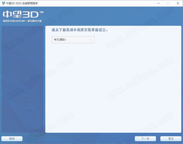 1、首先在本站下载好数据包后进行解压得到安装程序“ZW3D2022_Native_x64.exe”,鼠标双击运行进入安装向导,选择简体中文再点击下一步