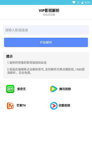 今天小编为你们带来一款专门的影视解析软件vip视频解析app安卓版,这款软件体积非常小巧,甚至比你手机里面的任何一款软件都要小,运行十分快速且简单,而且该软件具备的功能是其他软件所不能比的。首先它是一款影视播放软件,里面的影视资源很全面,用户可以在这里随意追剧,毫无限制。其次它也是一款异常强大的vip解析软件,是专门用来解析那些知名播放器里面的会员剧,现在有非常多的影视剧资源都在腾讯视频、优酷、爱奇艺、芒果这几大平台独家播出,而且几乎都是需要会员的剧,如果你不想花钱买会员追剧的话,那么这款软件将是最好的选择。该软件能够拿来解析知名播放器里面的所有会员剧,可以让用户毫无限制的免费看这些剧,而且解析方法也非常简单,只需要将需要解析的视频链接复制进来就可以开始解析免费追剧了。有了这款软件,再也没有你不能免费追的剧,有需要的朋友欢迎来本站下在该软件。