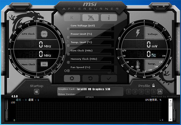 打开该软件的主界面之后,显卡当前工作状态详尽的展现在我们眼前。主界面左侧为控制部分,可以对GPU电压,核心频率,显存频率和风扇转速(需硬件支持)等进行实时调节。而右边部分则是监控部分,可以实时显示核心频率,GPU温度,显存占用率等。