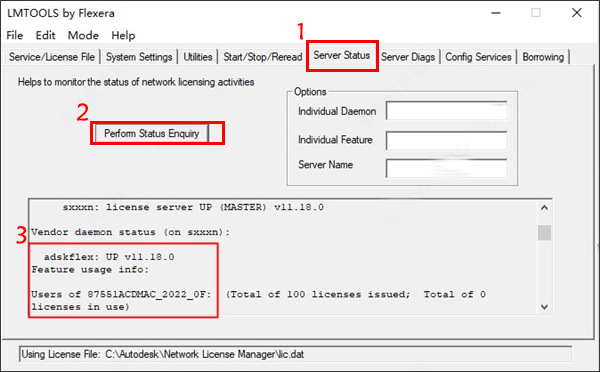 15、最后在“server status”点击“perform status enquiry”,看到有adskflex: UP v11.18.0就表示破解成功了,没有则找到问题重试;